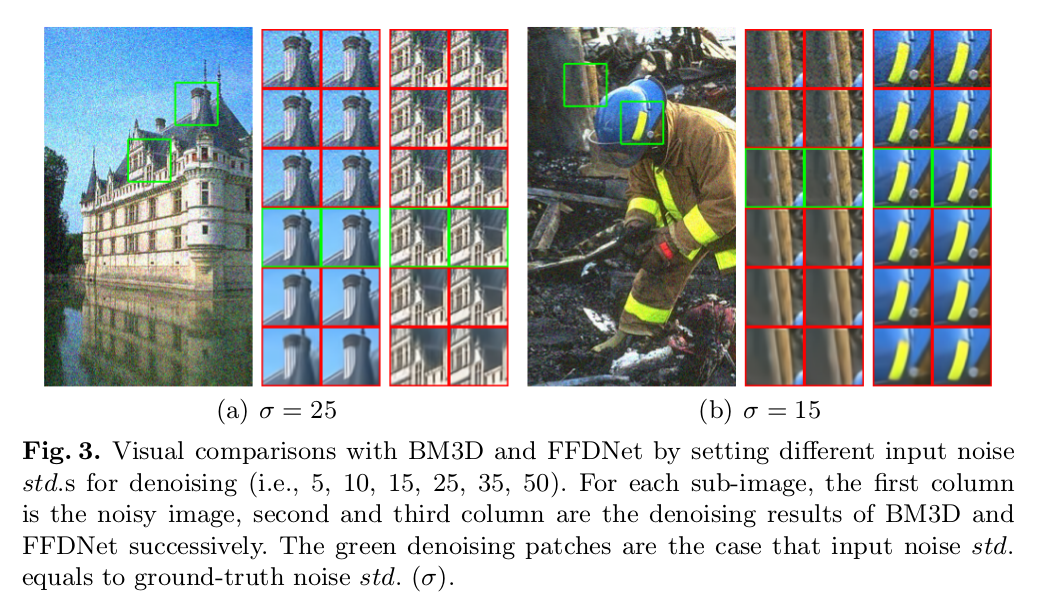 作者用传统的去噪方法 BM3D/FFDNet 做了一个实验。当给定的噪声等级和真实噪声等级一样时,去噪效果毋庸置疑是最好的。当给定的噪声等级低于真实噪声等级一样时,去噪结果仍然有可见的噪声;但当给定的噪声等级高于真实噪声等级一样时,仍然可以取得非常满意的结果。