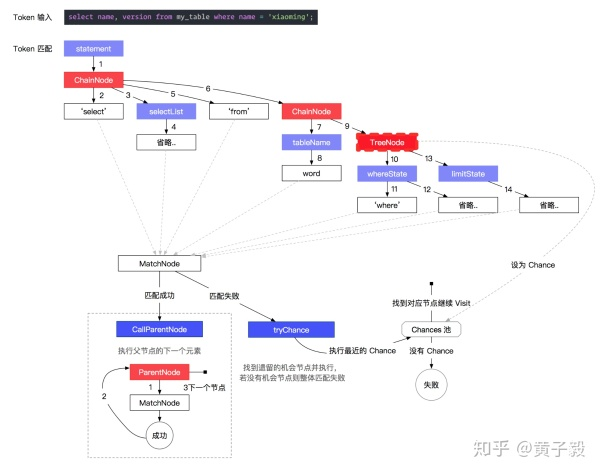 通过这张 Token 匹配过程图可以发现,当深度优先遍历文法节点时,匹配成功后才会返回父元素继续往下走。而当走到父元素没有根节点了才算匹配成功;当尝试 Chance 时没有机会了,就是错误发生的时机。