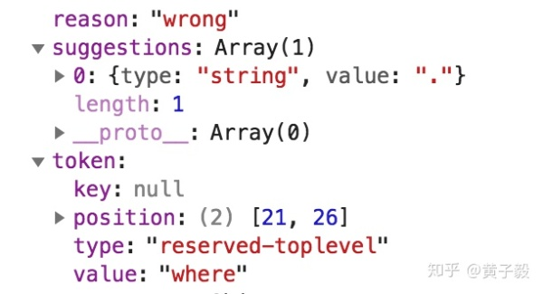 可以看到,程序判断出了 * 这个 Token 属于未完成的错误类型,建议在后面补全这 14 个建议字符串中任意一个。比较容易联想到的是 where,但也可以是任意子文法的未完成状态,比如后面补充 , 继续填写字段,或者直接跟一个单词表示别名,或者先输入 as 再跟别名。