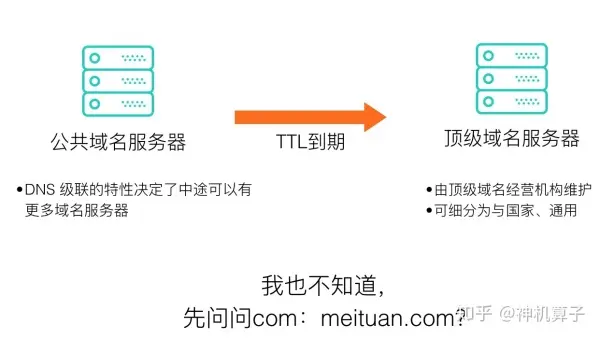 未命中缓存的查询,公共域名服务器会向顶级域名服务器进行查询。以我们的例子来说,因为公共域名服务器不知道meituan.com的解析权归谁,因此它会向顶级域名服务器——com域名服务器——发起请求,寻找meituan.com对应的域名服务器。顶级域名服务器一般是由域名经营机构来维护的,有些甚至归属国家机关管理,例如国别域名。理论上来说,在顶级域名服务器之上还有一个根域名服务器,不过在平时很难意识到它的存在。