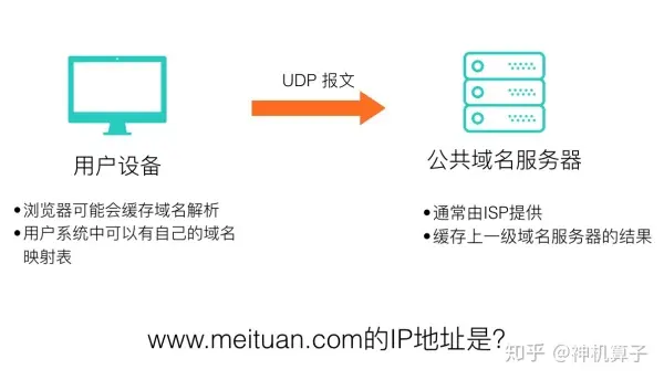在查找到meituan.com的域名服务器之后,就可以向该域名服务器查询www.meituan.com的 IP 了。这个过程是由上到下指定下来的,所以这种域名服务器可以被称为权威域名服务器。对于开发者来说,我们自己平时在域名服务商那里购买到域名之后,录入自己域名对应的 IP ,其实就是在向权威域名服务器录入信息。一些大型企业会自己维护权威域名服务器,这样既可以抵御一些针对性的攻击,同时也可以更好地优化解析的速度。