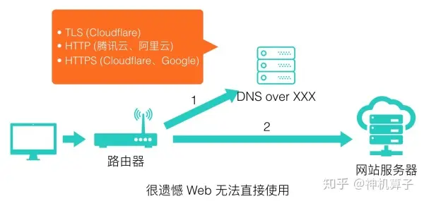 - DNS over TLS。这种协议是在 TLS 协议之上传输 DNS 内容,有点类似 HTTPS 和 TLS 的关系。