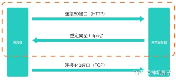在 HTTPS 协议建立之前,浏览器可能并不知道网站是基于 HTTPS 的,因此首先会去使用 HTTP 协议来访问网站,然后再经由网站的跳转改为 HTTPS 协议。这个过程我们上面已经说过了。