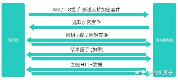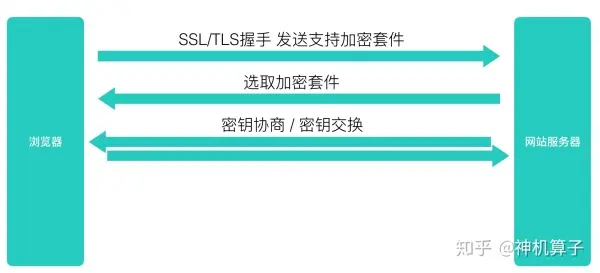 在加密套件选取完成之后,客户端和服务端就会开始进行密钥协商。密钥协商这个过程有时也被称为“密钥交换”,但其实在协商的过程中,交换的并不是密钥,而是“生成密钥用的信息”。下面是网上一张非常好的密钥协商过程图,即使没有密码学知识也可以看懂: