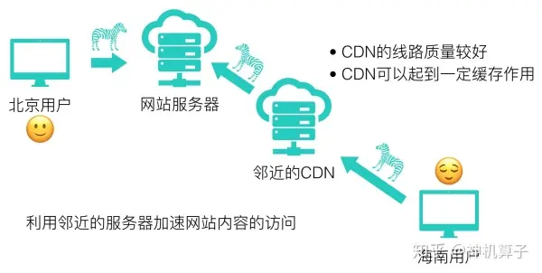 通常我们在部署网站时,会把网站部署在自己企业对应的机房内,比如美团在北京就有若干机房。这对于离机房近的用户,是非常有利的事情,用户可以快速下载到网站的内容,包括静态资源。但是对于距离机房远的用户——比如海南的用户,由于距离客观的存在,他们下载我们网站的内容时,速度可能就不那么理想了。除此之外,不同的宽带运营商线路不同,对下载速度也有不小的影响。