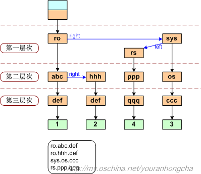 接下来讨论一下property的存储机制,不太想trace整个加载属性文件的过程,property在内存中存储使用的是字典树的数据结构,它的优点是利用字符串的公共前缀来减少查询时间,这估计就是使用字典树的根本原因吧,因为在property中是存在很多开头相同属性,如http://ro.xxx这种