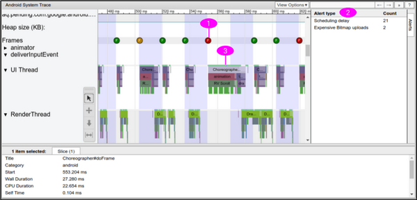 - Systrace会监测你App中的问题并会在单独帧和警告栏里面展示警告提示信息;跟着这些提示的指引来分析问题是最好的选择。