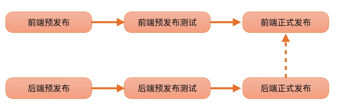 在这种情况下,前端团队和后端团队是两个不同的团队,可以独立开发和部署,但在发布的时候则有些不同。由于用户是最后感知功能变化的。因此,为了避免界面报错找不到接口,在新增功能的场景下,后端先发布,前端后发布。在删除功能的场景下,前端先发布,后端后发布。