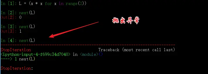 通过列表生成式构建的生成器,其内部已经自动帮我们实现了抛出异常这一步。不信我们来看一下。