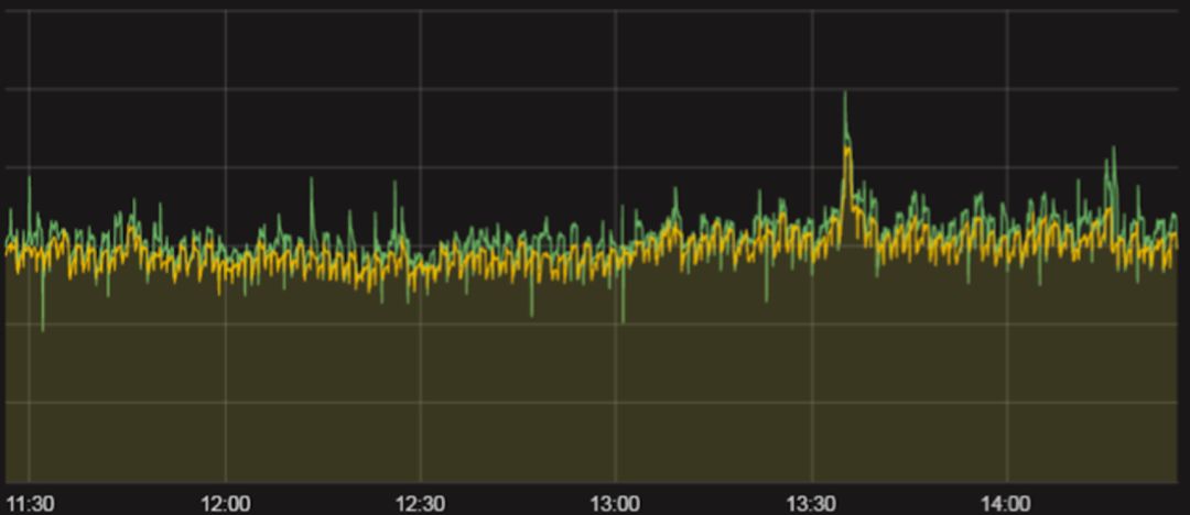 以下是负责交易处理的在线核心服务的RT曲线图,其中绿色曲线代表混部集群中的RT表现,黄色曲线为非混部集群的RT表现,可以看出,两条曲线基本重合,混部场景中的平均RT较普通集群差5%以内,符合服务质量要求: