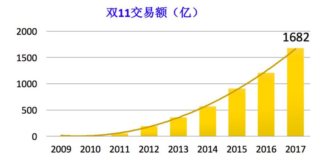 上图是阿里巴巴从2009 年开始做双十一购物狂欢节以来的历年交易额曲线,对业务同学而言,这张曲线增长图比较漂亮,但是对于技术人员和运维人员而言,这张图背后意味着重大的挑战和资源压力。