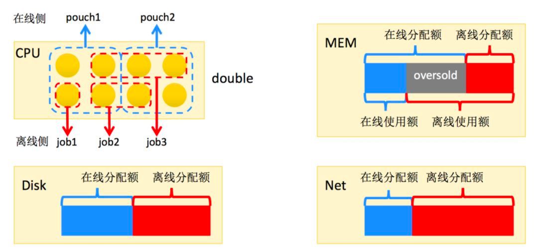 上文有提到两个资源调度器(在线调度器Sigma和离线调度器Fuxi),在线业务以Pouch容器做为资源单元,Pouch容器会绑定一定的CPU核,供某个在线业务使用。Sigma 会认为整台物理机都属于在线。