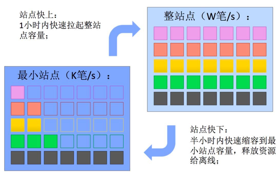 于是我们提出了站点快上快下的概念,其面向在线业务而言,如前文所述,每个混部集群即为一个在线交易单元,其独立支撑一小部分用户的交易行为,因此我们也将其成为“站点”,我们把在线站点的整体容量做伸缩变换,就是快上快下的过程。如下图所示: