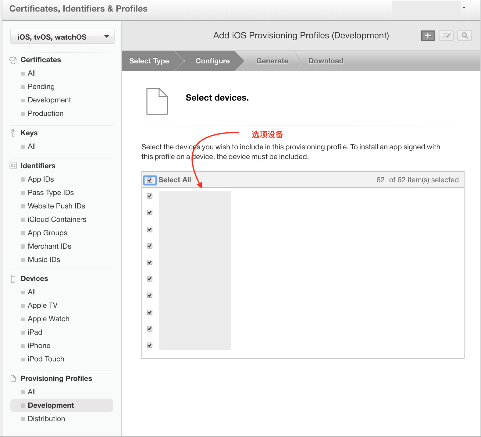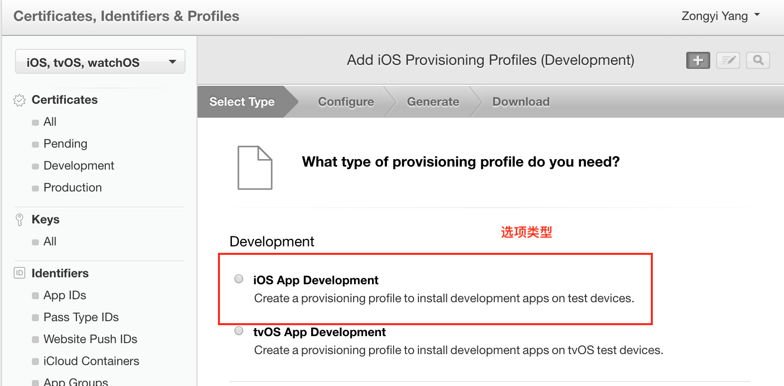 2.选择证书的类型,这里选择开发证书。