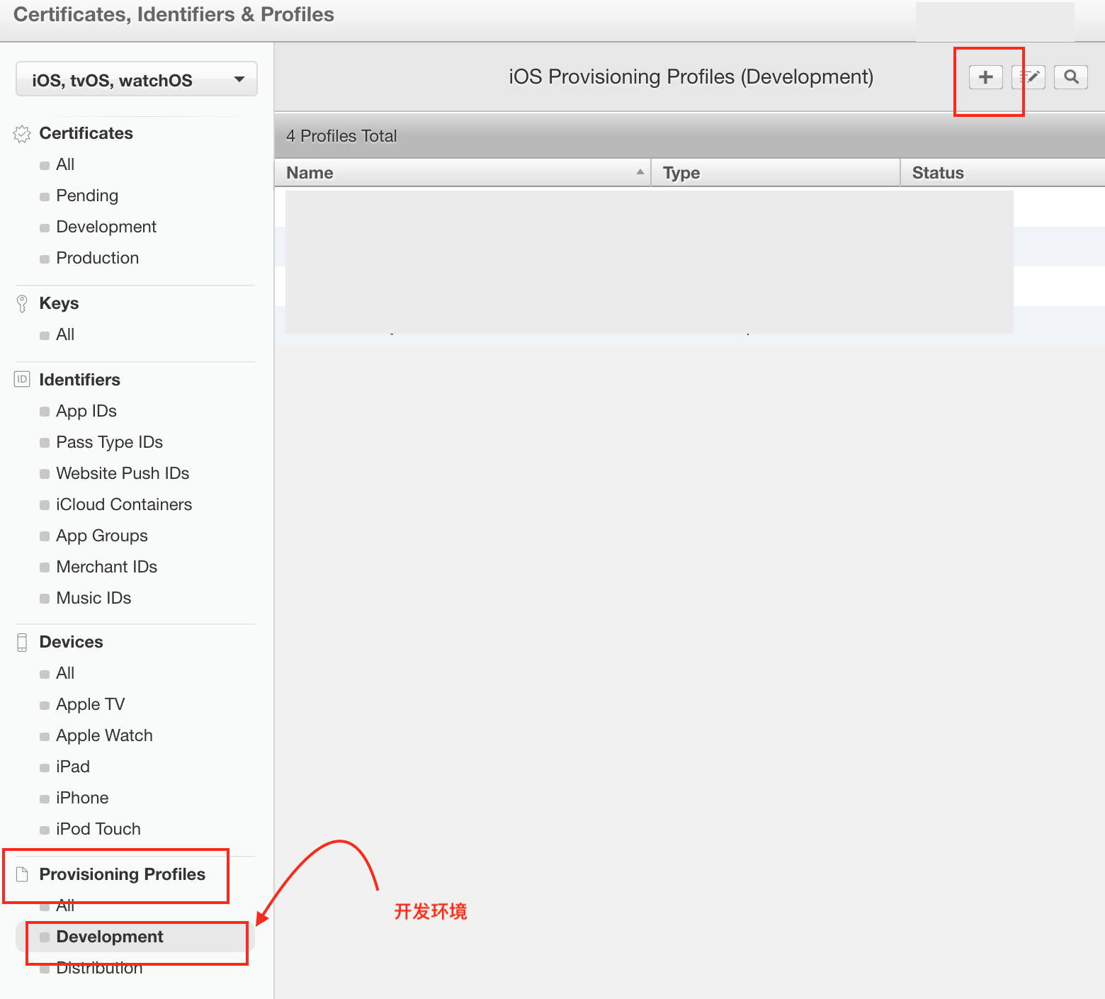 Certificates,Identifiers&Profiles-->Provisioning ProfilesDevelopment路径,找到Profile文件的列表页面。添加+准备添加新的PP文件。