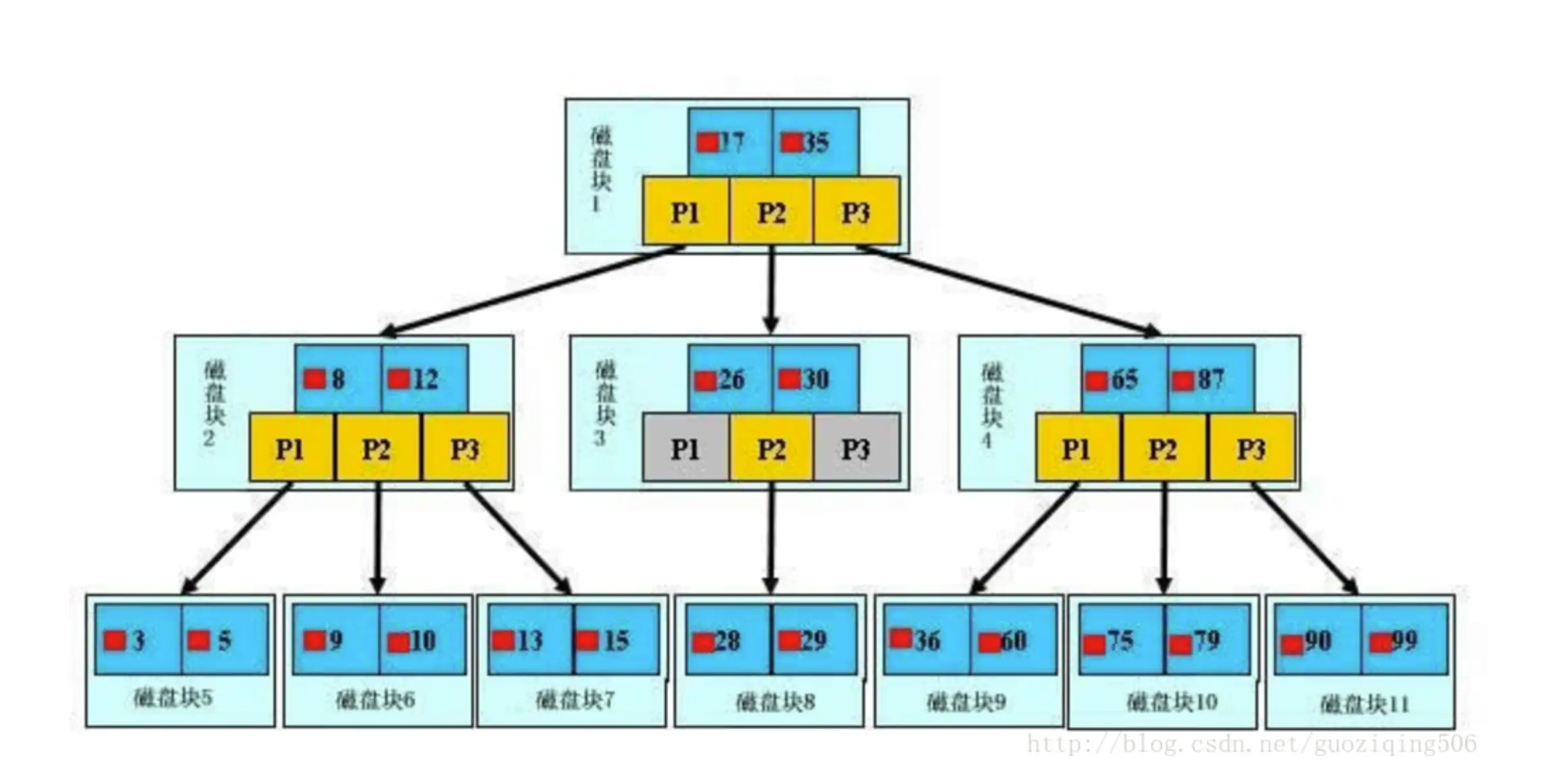 2.b+树,在各个节点之间存在指针。方便区间范围内的查询。