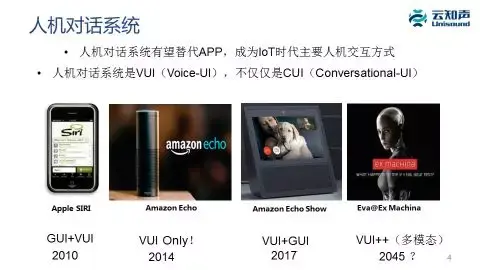 更高级的形态是现在很多电影都能看到的像Eva、《钢铁侠》或者《西部世界》里面这种人形的机器人,完全可以跟人自由对话,它的交互是 VUI++,真正模拟人的多模态的交互形态,这个时间点也许在 2045 年会出现。