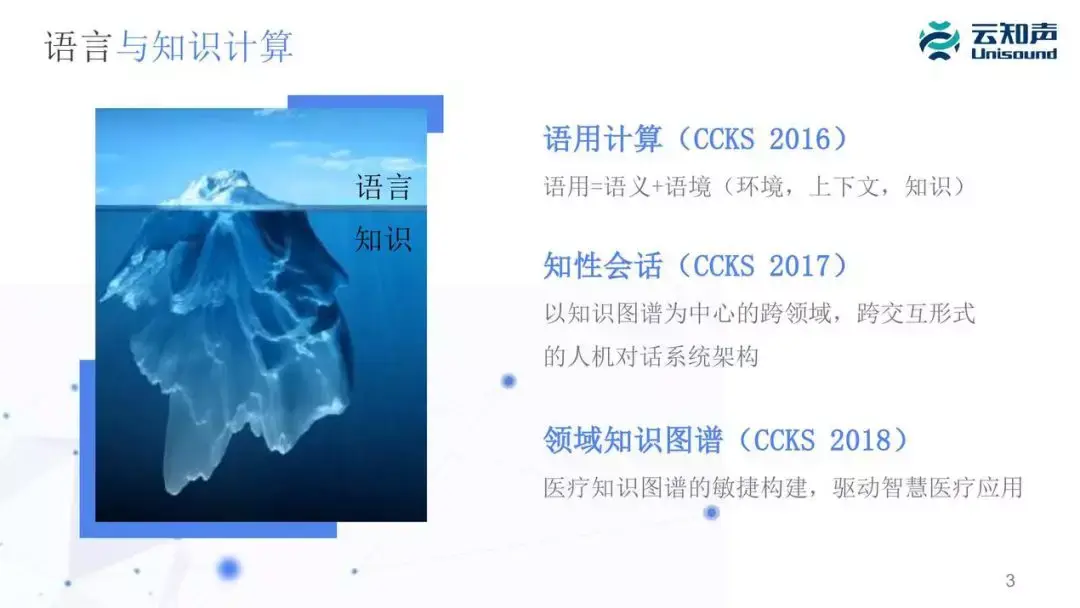 语言和知识是密切相关的。这张冰山图很形象地解释了语言和知识的关系,我们看到的语言只是冰山上的一小角,就是我们说的话。但是你如果想理解这句话,跟这句话相关的背景知识就像冰山下面这一大块。
