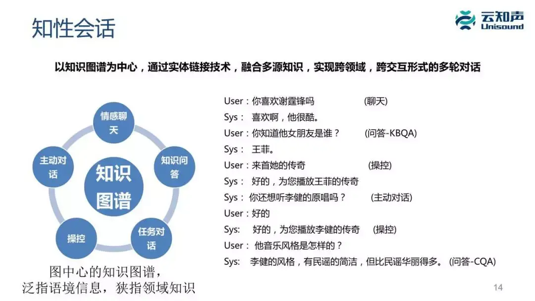 你看这个例子的话,它涉及很多跟音乐相关的知识,还包括一些歌星的人物相关的知识。交互形式有聊天、问答、操控、主动对话,是通过知识把它们关联在一起,你会感觉整个对话是个很流畅的对话。
