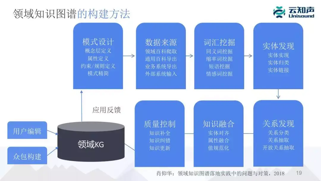 目前大部分是数据驱动的方法,就是我们通过数据挖掘去自动构建知识图谱,适当地基于人工的 review。我倾向于极端的方法,我推荐的方式是知识图谱的构建整个是全自动,但是也需要专家的参与,但是专家参与不是做 review、不是做构建,而是做评测。整个知识图谱的效果根据应用的效果说话,这个应用不能假设整个知识图谱是完全正确的、完整的的。我们可以通过快速迭代,不断的对知识图谱去做更新,然后根据自动化的测试或者根据人工的抽样检查和应用的效果去看知识图谱的质量。只要我们知识图谱的质量能够满足应用的需求就 OK。