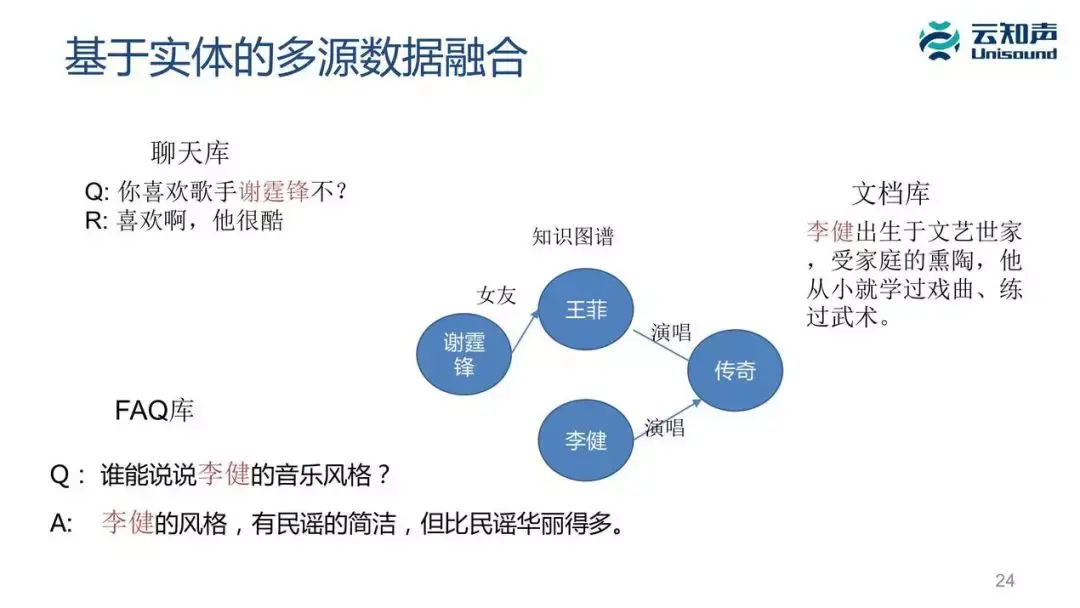 我们也会从网上找到很多文档,包括百科的文档或者网页性的文档,我们对这些文档、聊天库、FAQ 库、文档库,我们都要去做实体链接,把这里面出现的歌手和我们知识图谱的歌手关联起来。