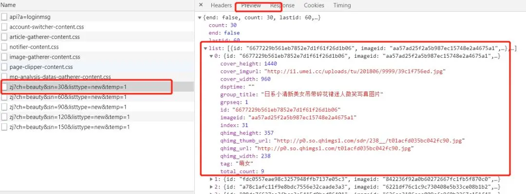 返回的是 JSON 数据格式,其中 list 字段把图片的一些信息都保存在这里面。比如我们需要的图片地址信息 cover_imgurl。另外观察 Ajax 请求的参数信息,还有一个 sn 一直在变化,这个参数很明显就是偏移量。当 sn 为 30 时,返回的是前 30 张图片,依次类推,我们只需要改变 sn 的值就可以一直获取图片的信息。