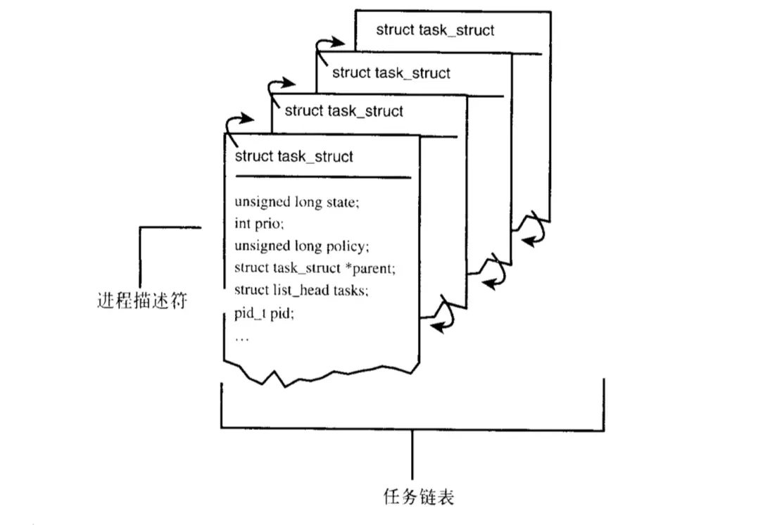 - 链表中每一项都是task_struct类型,称为进程描述符,包括一个进程的所有信息。路径:/include/linux/sched.h