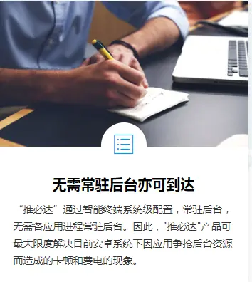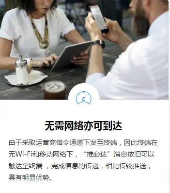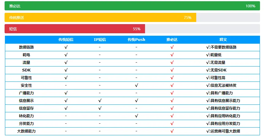 推必达”利用手机号寻址,通过运营商级信令通道下发至终端,由终端系统级进程解析。 具有无数据网络亦可达,无需常住后台亦可达,无App安装亦可达三大特性。