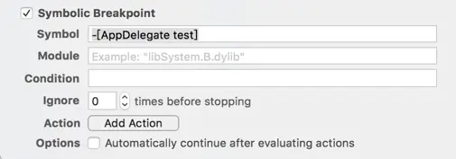 符号断点其实就是对一个特定的函数名下断点,这里得方法可以是OC的方法也可以是一个C++的函数名。 在导航区选择断点tab页 -> 点击最下面的加号 -> Add Symbolic Breakpoint