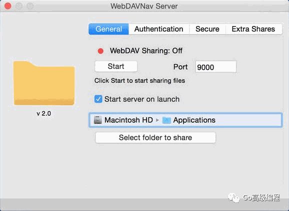 目前常见的NAS都提供WebDAV服务功能,很多手机应用也是通过WebDAV协议来实现应用间的文件共享。要提供自己的WebDAV服务首先要安装相应的软件。macOS下可以从App Store中安装免费的WebDAVNav Server软件。WebDAVNav Server服务启动界面如下: