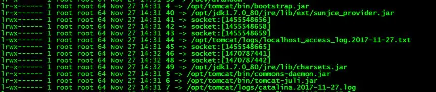 因为st = 0A代表listen,所以从其中挑选出st = 0A的数据,取出对应的inode号,这里这个inode号是socket号,则问题转换为了这个进程是否还存在这个socket号代表的socket。在/proc/$pid/fd下有该进程所有的fd(file descriptor),截取一段举个例子。