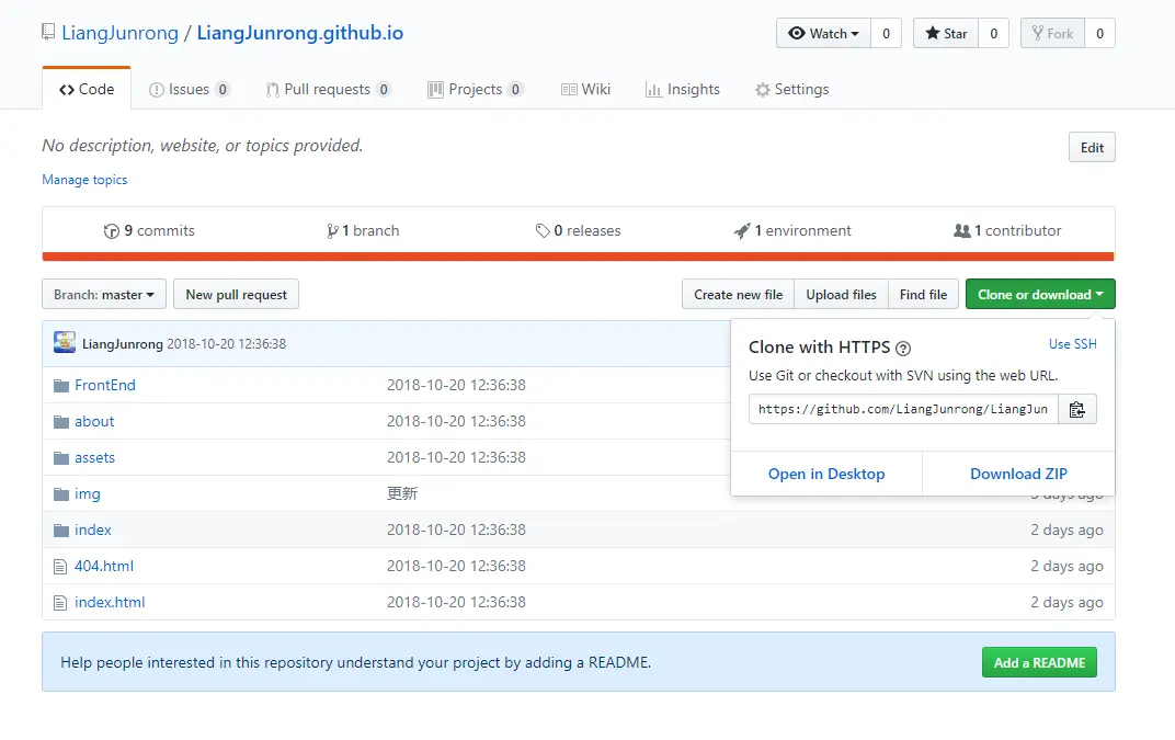 用户名.github.io,例如我的就是:LiangJunrong.github.io,然后点击 Create repository 即可创建一个部署好的环境。