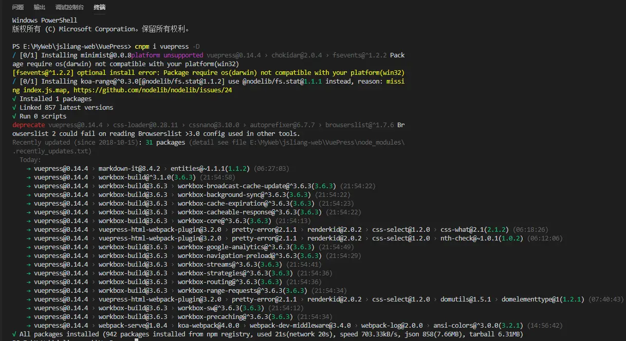 在你需要存放的目录中,通过终端命令行安装 VuePress:npm i vuepress -D