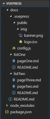 其中,.vuepress 存放 VuePress 的配置目录,public 中存放共有的文件,config.js 为 VuePress 的配置文件,listOne、listTwo 是侧边栏组,对页面进行个分类。