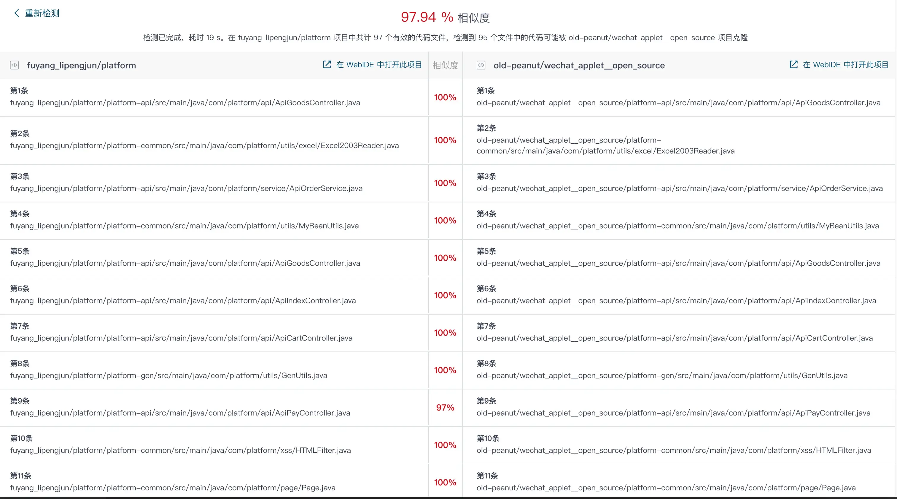 我们以这两天收到的用户举报的一个项目为例:https://gitee.com/old-peanut/wechat_applet__open_source ,该项目与原项目 https://gitee.com/fuyang_lipengjun/platform (该项目为码云 GVP 项目)进行比对,下图是详细的比对结果,二者的相似度高达 97.94% 。