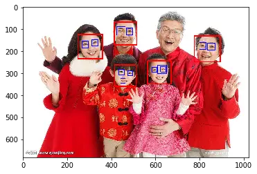 2,从结果上可以看出,虽然能够有效检测,但是还有些人脸或鼻子,眼睛等难以被检测到,此时可能要调整检测函数detectMultiScale()的参数,如果调整参数仍然不理想,就需要修改特征检测级联文件cascade_file这个xml了。