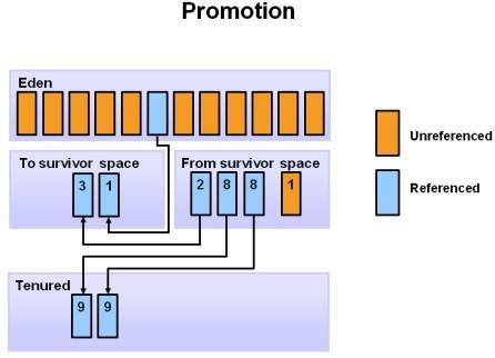 6、这幅图展示了从年轻代到老年代的提升。当进行一个小垃圾收集之后,如果此时年老对象此时到达了某一个个年龄阈值(例子中使用的是8),JVM会把他们从年轻代提升到老年代。