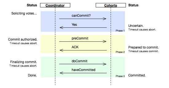 两段提交最大的问题就是第3)项,如果第一阶段完成后,参与者在第二阶没有收到决策,那么数据结点会进入“不知所措”的状态,这个状态会block住整个事务。也就是说,协调者Coordinator对于事务的完成非常重要,Coordinator的可用性是个关键。 因些,我们有了三段提交。