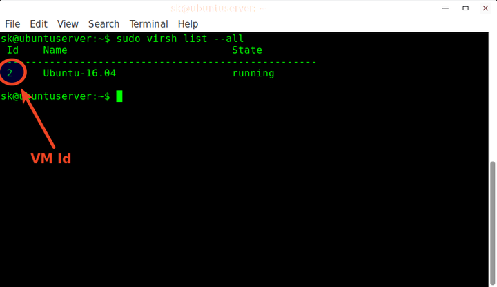 正如在上面的截图所看到的,Ubuntu 16.04 虚拟机的 Id 是 2。因此,启动它时,你也可以像下面一样只指定它的 ID。