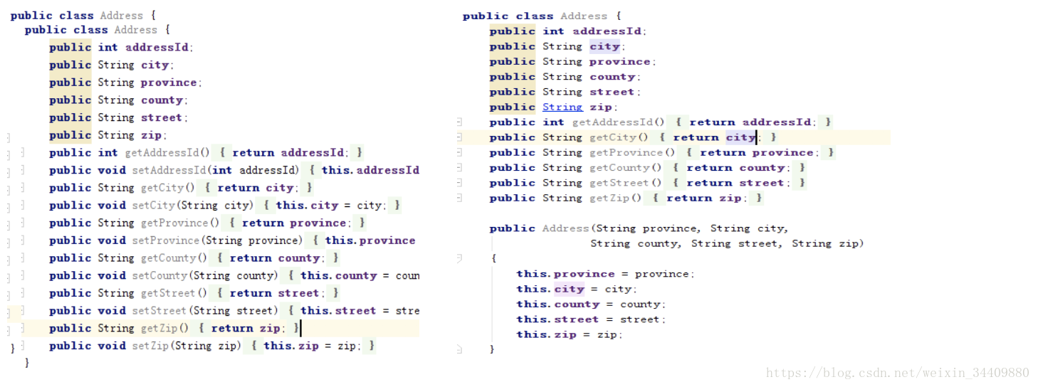 贫血:人在查询地址的时候,在上述失血模式中,肯定会去调研addressDao.find(),在贫血中就不会了,贫血中在一个类Person中给另外一个类Address赋值。
