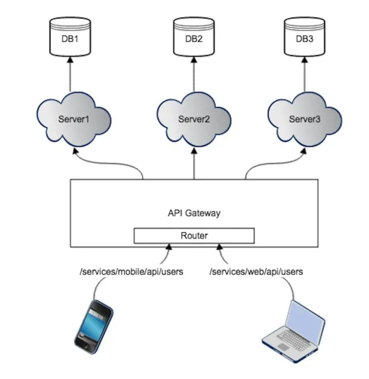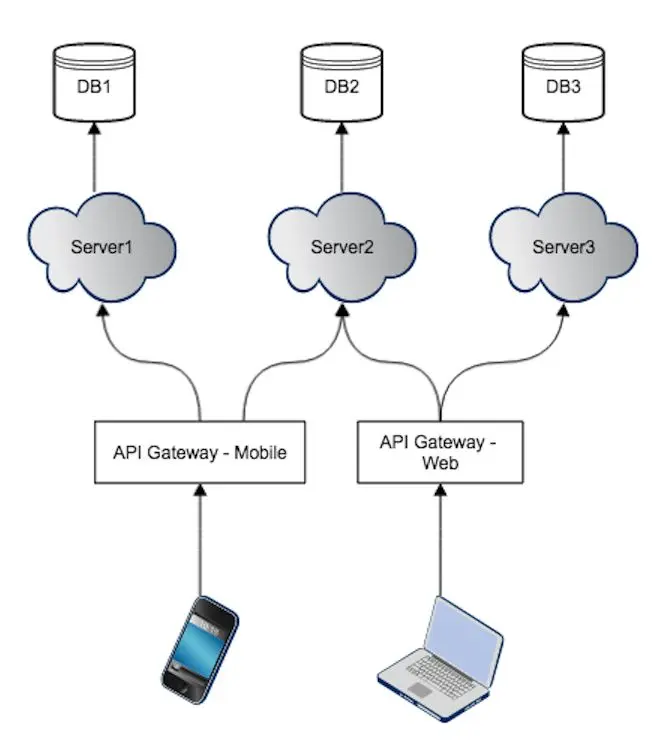 单个 API Gateway 实例,为多种客户端提供各自不同的API。比如对于 users 列表资源的访问,web 端和 App 端分别通过 /services/mobile/api/users, /services/web/api/users服务。API Gateway 根据不同的 API 判定来自于哪个客户端,然后分别进行处理,返回不同客户端所需的资源。