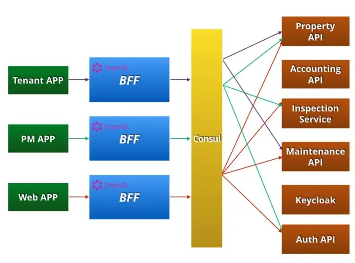 整体来看,我们的前后端架构图如下,三个 App 客户端分别使用 GraphQL 的形式请求对应的 BFF。BFF 层再通过 Consul 服务发现和后端通信。