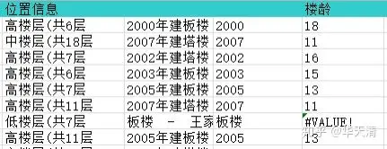 对位置信息这列用分列功能,把建筑年代单独作为一列,再用mid函数提取出年代数值,最后用减法算出楼龄。