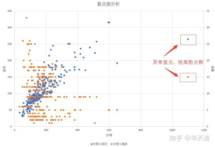 三、从图上的散点也可以明显的看出在X为1000和1200之间,两组数据分别存在一个异常值点,脱离了散点群,但实际上房产作为大宗商品,其价格是由市场供求关系决定的,波动范围很大,不能说是错误值。