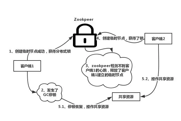 如上图所示,客户端1发生GC停顿的时候,zookeeper检测不到心跳,也是有可能出现多个客户端同时操作共享资源的情形。当然,你可以说,我们可以通过JVM调优,避免GC停顿出现。但是注意了,我们所做的一切,只能尽可能避免多个客户端操作共享资源,无法完全消除。