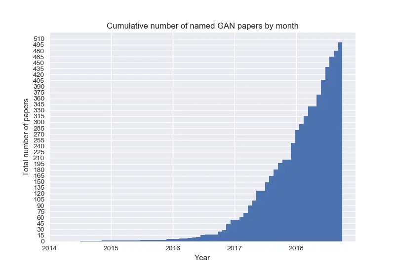 要说最近几年在深度学习领域最火的莫过于生成对抗网络,即 Generative Adversarial Networks(GANs)了。它是 Ian Goodfellow 在 2014 年发表的,也是这四年来出现的各种 GAN 的变种的开山鼻祖了,下图表示这四年来有关 GAN 的论文的每个月发表数量,可以看出在 2014 年提出后到 2016 年相关的论文是比较少的,但是从 2016 年,或者是 2017 年到今年这两年的时间,相关的论文是真的呈现井喷式增长。