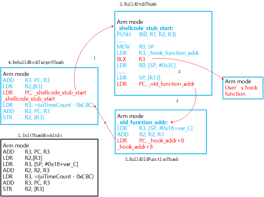 这张图是一张arm下最基本的hook流程,从上图中可以看出主要有如下几个步骤: