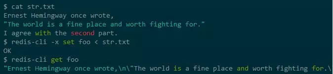 如果一个字符串有多行,你希望将它传入 set 指令,redis-cli 要如何做?可以使用 -x 选项,该选项会使用标准输入的内容作为最后一个参数。
