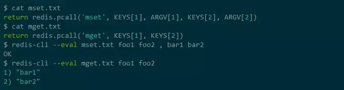 下面我们以脚本的形式来执行上面的指令,参数形式有所不同,KEY 和 ARGV 之间需要使用逗号分割,并且不需要提供 KEY 的数量参数