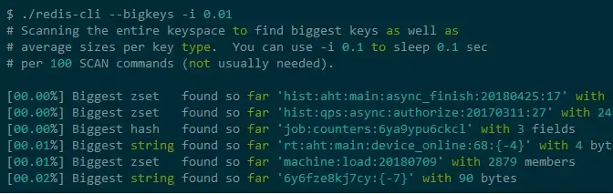 redis-cli 对于每一种对象类型都会记录长度最大的 KEY,对于每一种对象类型,刷新一次最高记录就会立即输出一次。它能保证输出长度为 Top1 的 KEY,但是 Top2、Top3等 KEY 是无法保证可以扫描出来的。一般的处理方法是多扫描几次,或者是消灭了 Top1 的 KEY 之后再扫描确认还有没有次大的 KEY。